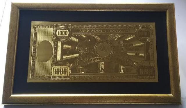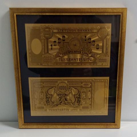Gal kas nors norėtų įsigyti suvenyrinį 1000 litų banknotą, labai kokybiškai pagamintą 1924 m. banknoto kopiją? Profesionaliai įrėmintas sendinto stiliaus rėmelyje, puikus dalykėlis papuošti namus ar dovanai. Rėmelio matmenys 18x29cm, paties banknoto - 11x22cm. Kaina 8EUR Gali būti įrėminti du banknotai, tuomet rėmelyje matosi abi banknoto pusės. Rėmelio matmenys 29x31cm. Kaina 15EUR. Tel. 8-618-88411, Kaišiadorys. Siunčiu registruotu paštu.