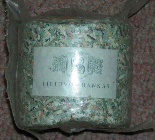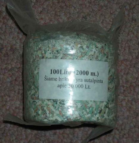Smulkiai pjaustytų litų faršas, be galiojimo :) Jei rimtai: sunaikinti 100lt banknotai kaip suvenyras iš Lietuvos banko.