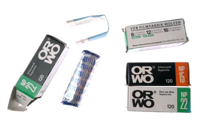 Pasibaigusio galiojimo 120 plati fotojuosta ORWO, juodai balta. Yra ir keletas spalvotų.