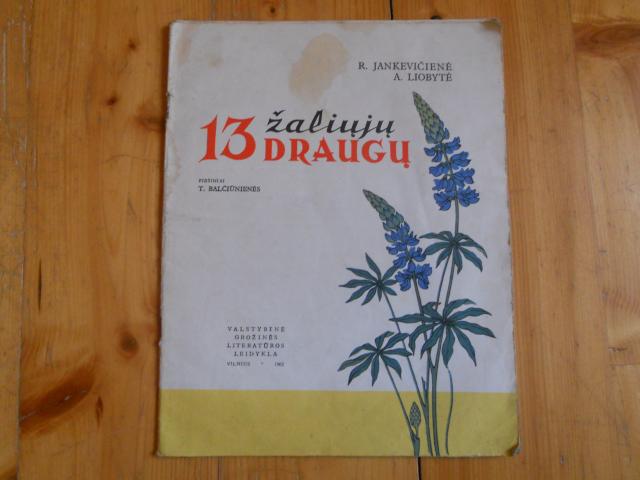 13 zaliuju draugu, R. Jankeviciene, A. Liobyte, 1962 m. , iliustravo T. Balciuniene, be virselio.
