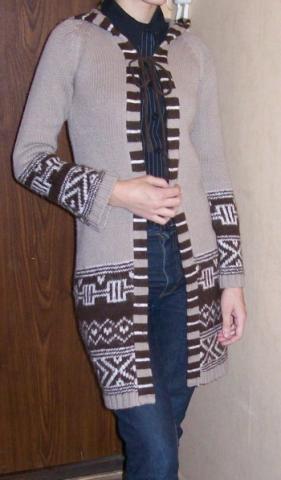 Ilgas susiaučiamas megztukas. Tinka 146 - 152 cm ūgiui (fotografuota ant 170 cm ūgio). Susiriša viršuje. Su kapišonu.