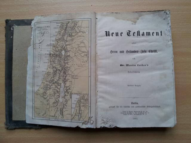 sena, vokiška. Naujojo testamento knyga. Su Palestinos žemėlapiu. Pagaminta Berlyne