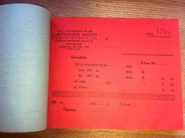 Parduodama 1936 metų " Lietuvos aido" sunumeruota prenumeratos knygelė. Iš viso: 50 psl.