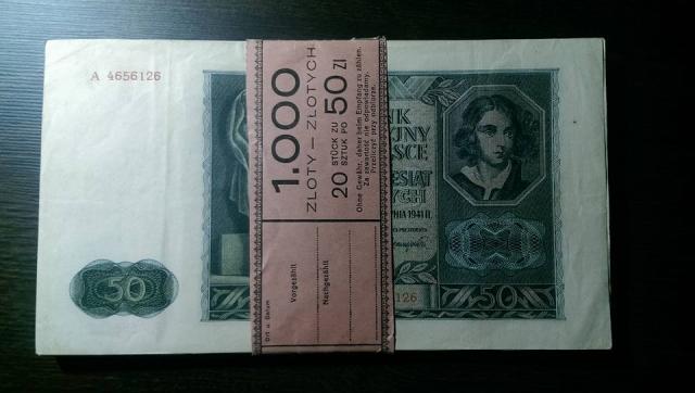 1941 50 zlotu. 20 vnt supakuota i bankine juosta. Banknotai suristi is apyvartos