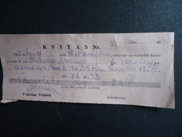 1943-08-03 dienos kvitas dėl sumokėtų valsčiaus viršaičiui pinigų ir baudos