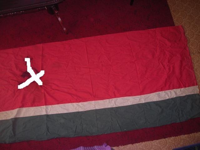 Gauta iš buvusios mokyklos ūkvedžio. Mokykloje gauta 1953m ir naudota pagal paskirti iki 1988m. Yra defektas iplyšusi kūjo ir pjautuvo vietoje (sajūdžio laikų pasekmė).