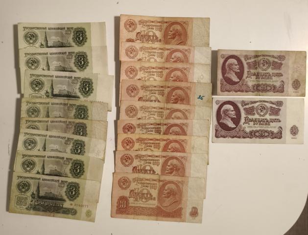 Rusijos rubliai po 3 rublius 8 vnt Po 10 rublių 9 vnt ir du po 25 rublius kupiūros Būklė yra įvairių ir geresnių ir prastesnių . Siulikite kaina
