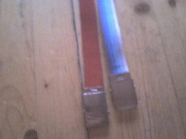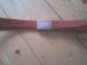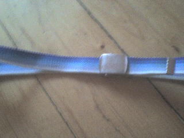 vienas diržas raudonas, kitas - keistai mėlynai liniuotas
