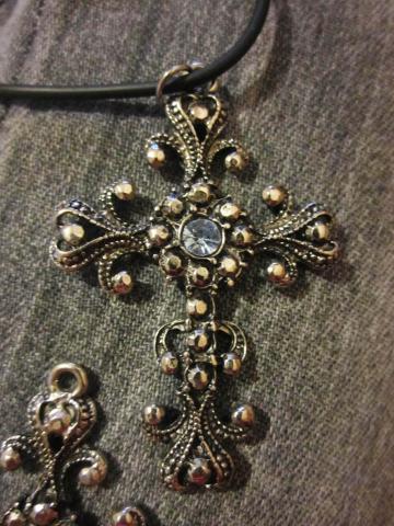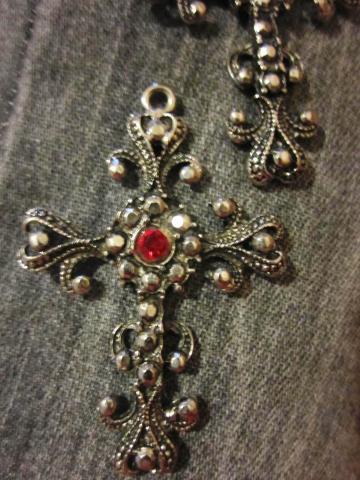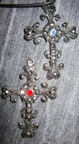 Du kryziukai ir viena grandinele juos pakabinti, su raudona ir melyna akute