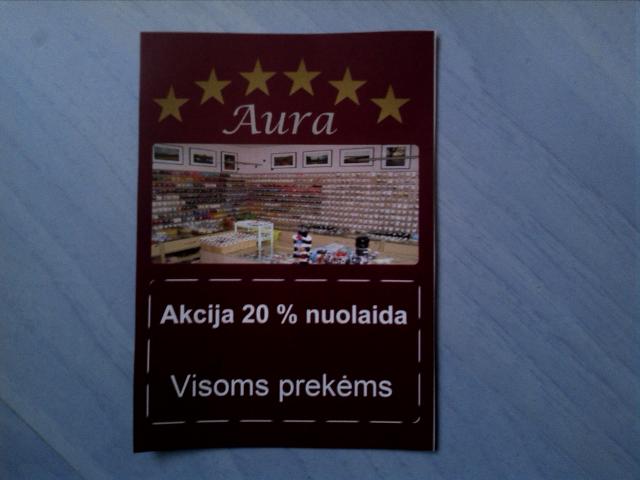 20% nuolaidos kuponas visoms prekėms parduotuvėje " Aura ", esančiai Utenoje. Kuponas yra TIKRAS ir tikrai nepadirbtas. Parduotuvėje rasite visokių prekių rankdarbiams. : ) Kuponas labai puikus, geras, nes jis neturi galiojimo pabaigos, galiojimas NERIBOTAS : )