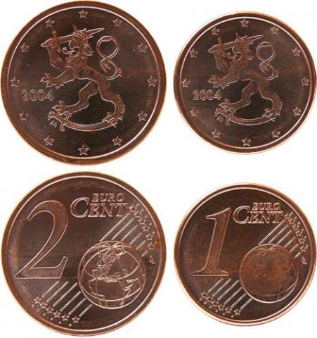 Parduodami 2004 m. Suomijos 1 ir 2 euro centai. Kaina - 1 euras.