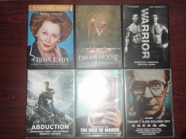 Pigiai parduodu 6 DVD. Filmai žiūrėti tik po 1 kartą, todėl jie yra geram stovy. Sąrašas: Geležinė Ledi (The Iron Lady), Klastingi Namai (Dream House), Kovotojai (Warrior), Pavojinga tiesa (Abduction), Purvini žaidimai (The Ides of March), Bastūnas, Siuvėjas, Kareivis, Šnipas (Tinker Tailor Soldier Spy).