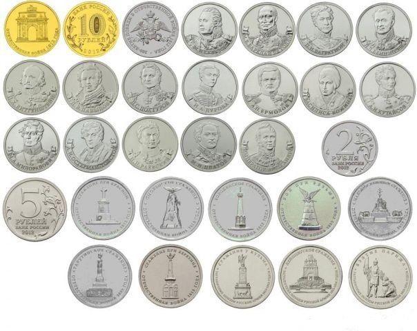 2012m Rublių komplektas 200 metų karui 1 vnt - 10 rublių 10 vnt - 5 rubliai 17 vnt - 2 rubliai