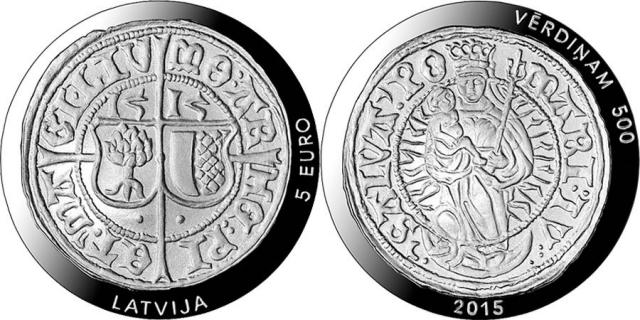 2015 m. Latvijos 5 eurų sidabrinė moneta skirta Livonijos ordinui