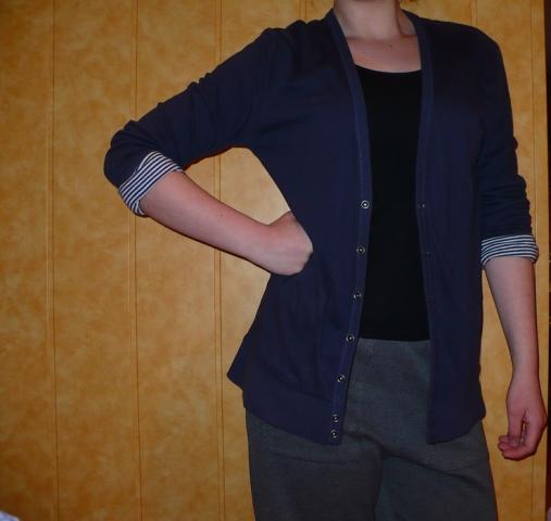 Labai grazus uzsegamas megztukas is uk. ji galima uzsideti dviem budais. yra tamsiai melyna , ir dryzuota kaip matote :) dryzuotoje puseje yra kisenes :) labai graziai ziurisi prie visko. dydi raso s , bet manau kad tiktu ir m. s, s-m