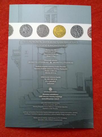2O15 metų LB lankstinukas 5O eurų monetai skirtai LDK kalybai.