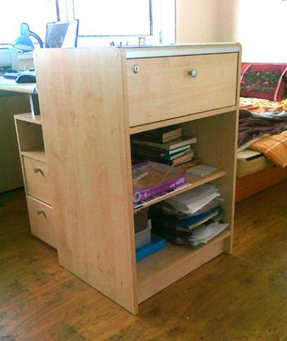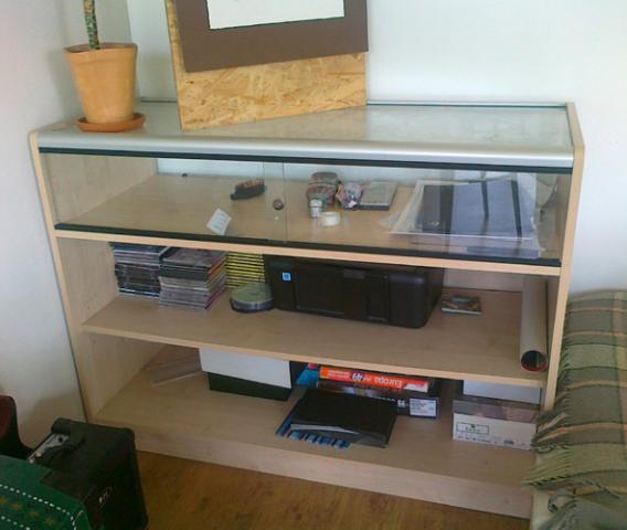 3-jų dalių komplektas .Aukšta vitrina su spintele apačioje, įmontuotu apšvietimu - užrakinama. Tumba su užrakinamu stalčiumi ir dviem lentynomis. Prekystalis-vitrina: užsirakina stiklinė dalis, turi dvi pailgas lentynas. Labai gerai išlaikytos.