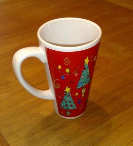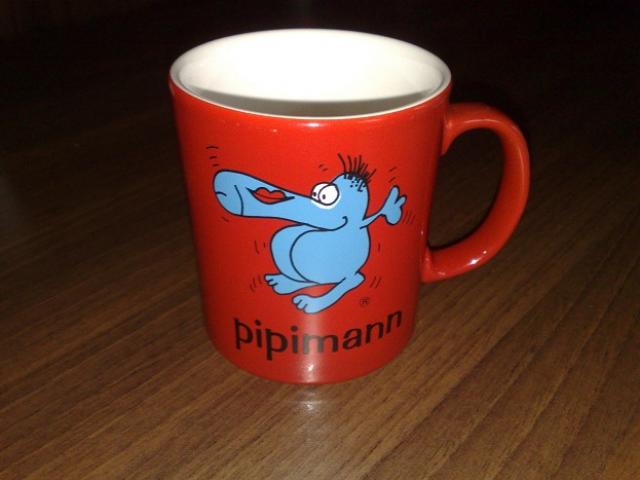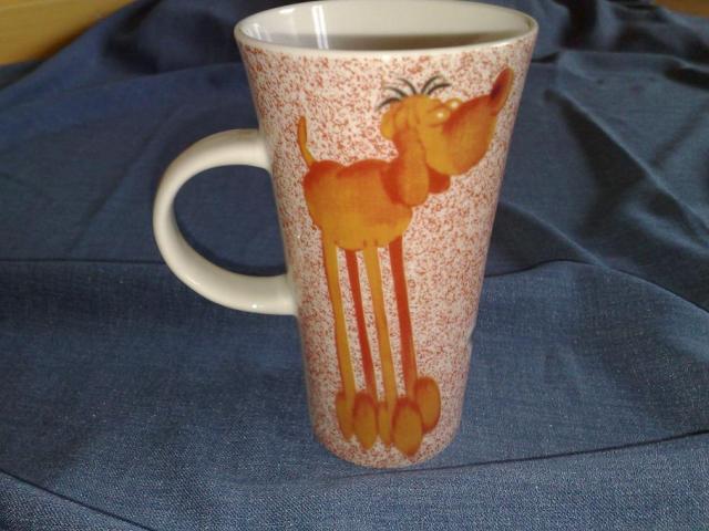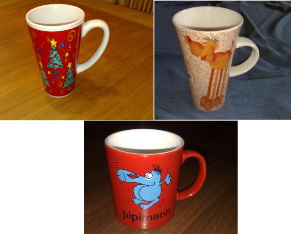 Puodelis su ilgakoju šuniuku; aukštis - 14,5 cm. Didelis kalėdinis raudonas puodelis; aukštis - 15,5 cm. Linksmas puodelis "Pipimann"; aukštis - 9 cm. Kaina - po 3 eurus.(c)