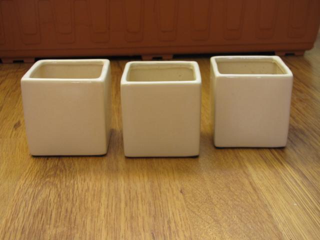 3 kvadratiniai , nauji, šviesūs , glazūruoti vazonėliai, tinka kaktusiukams, (visi trys 6 lt).