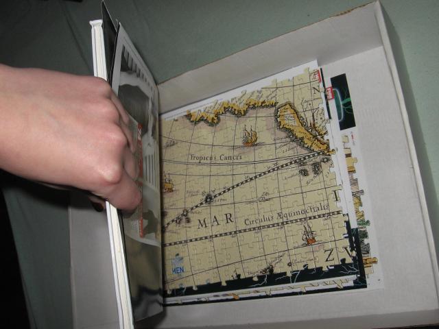 Dalis detalių priklijuota ant popieriaus (bet lengvai nusiima, tad ne bėda). Šiuo metu dėlionė sudėliota ant popieriaus lapų. Su ja viskas gerai.