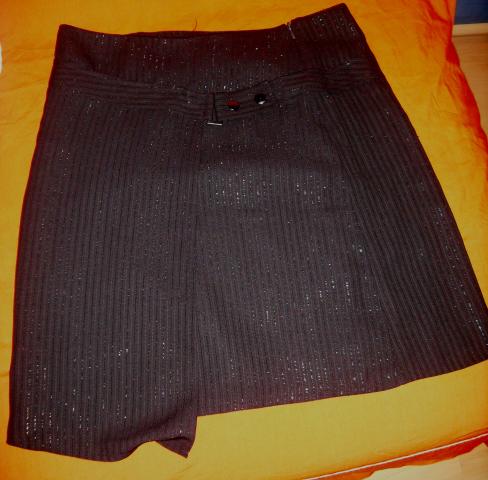 Gražus, blizgiomis linijomis einančiomis į apačią sijonukas, vienas galas priekyje ilgesnis, su imitaciniu 2 kniedžių užsegimu. Medžiaga geros kokybės, nesiglamžo. Dydis 38, tinka ir 40d nesiojančioms ;)