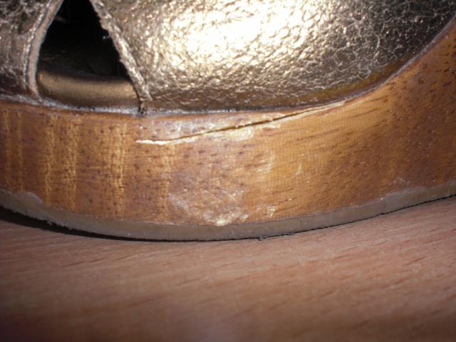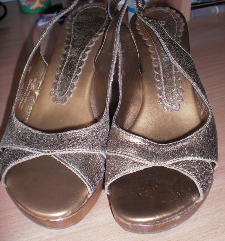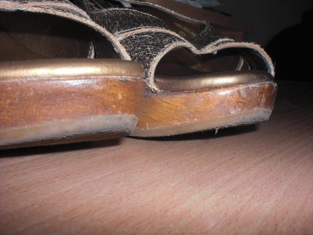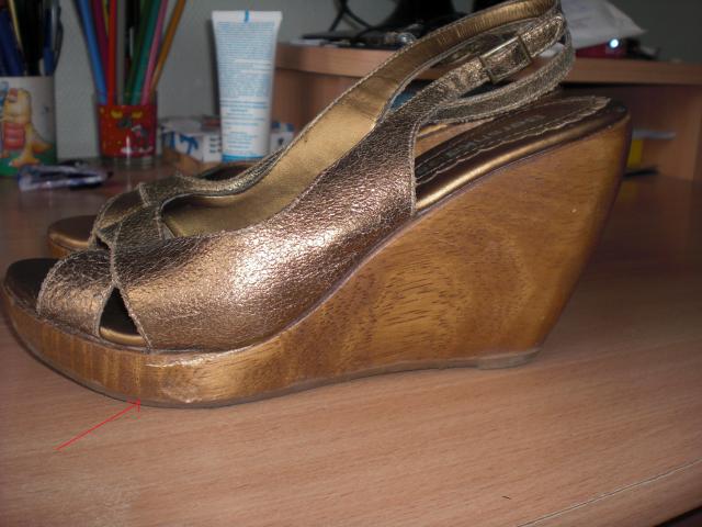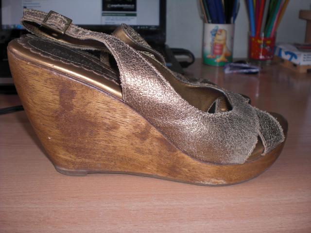 Medinės platformos Bershka basutės. Dydi rašo 36, bet labiau atitinka 37. Nes as nešioju 37,5 ir man buvo dar geros. Minkstas vidus, patogios nešioti. Defektas matosi 2 foto (dešinė koja), bet tai visai nesudaro jokių nepatogumų ir net nešiojant nesimato. Kairės kojos irgi truputi pabrozdinta, bet irgi mažai pastebima. 5 foto parodyta kad dešinės kojos priekis buvo "užkabintas" bet šito jau tikrai nepastebės niekas einant gatve :) Mokėta daug, natūrali oda.