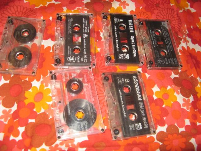 visos groja, nesutraukytos, beveik visos apsitrynę, ant 6 iš jų galima įskaityti užrašus, vienos užrašų vos keli matosi ir neaišku kokio atlikėjo kasetė, bet lietuviška. yra giulija , džordana, darius kripaitis ir t.t.