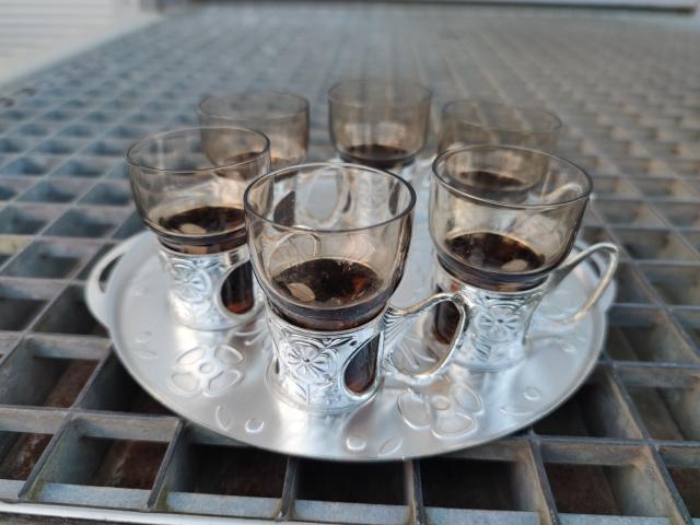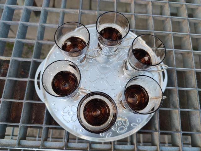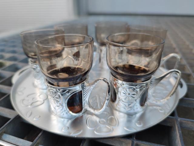 6 vnt. stiklinių taurelių su lengvo metalo lydynio laikikliais ir padėkliuku.