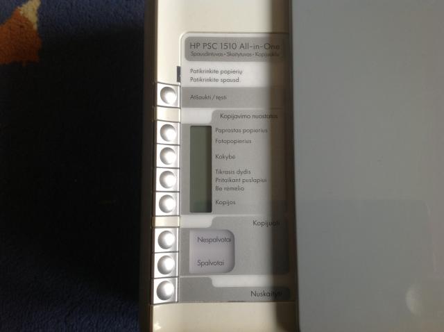 Labai geros bukles HP PSC 1510 all in one daugiafunkcis printeris,visas valdymas lietuviu kalba,idealiai veikiantis su visais maitinimo ir kitais laidais.Kompaktiskas,ilgis 43 cm ,plotis 28cm ir aukstis 16cm.