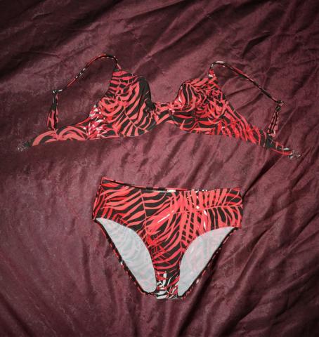 Parduodamas arba mainomas maudymosi kostiumėlis. Be defektų. Pirktas dėvėtas, reiktų perskalbti. Liemenėlės petnešėlės reguliuojamos, užsegimas plastikinis. Liemenėlės dydis - 85B; kelnaičių viršus - 32,5x2 cm.