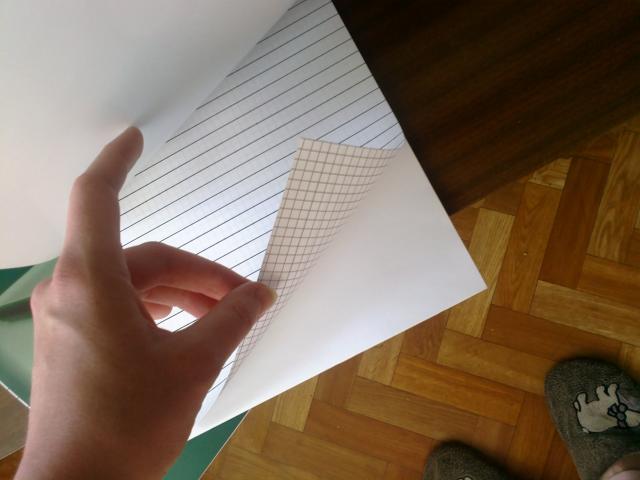 Balti lapai + papildomas languotas lapas, kurį galima pasikišti po baltu lapu norint lygiai rašyti, nenukreivaliuoti.