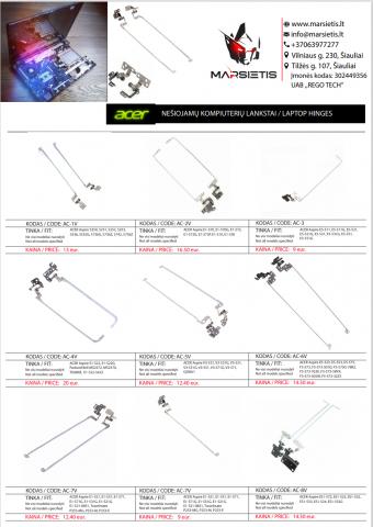 PIGIAUSIAI. ACER KOMPIUTERIO LANKSTAI, VYRIAI, EKRANO LAIKIKLIAI, ŠIAULIAI PIGIAUSIAI. ACER kompiuterio lankstai, vyriai, ekrano laikikliai Pristatymas visoje Lietuvoje per 1-2 d.d. (DPD kurjeriu, paštomatu, paštu, galima atsiimti vietoje). Suteikiama garantija 12 mėnesių. Visa konsultacija, remonto darbų užsakymas: +37063977277 / info@marsietis.lt / Vilniaus 230, Šiauliai Daugiau informacijos: www.marsietis.lt 1. ACER Aspire 5250, 5251, 5252, 5253, 5336, 5552G, 5736G, 5736Z, 5742, 5736Z, 5711, 52