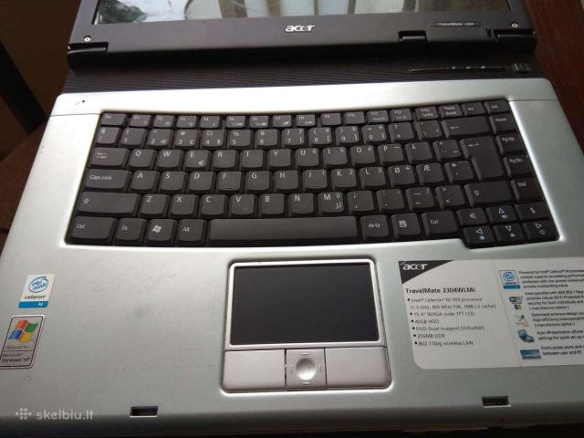 Veikiantis Acer TravelMate 2300 dalimis: CPU Intel Celeron M 350. Sveikas korpusas, vyriai motininė pl., klaviatūra. Nėra dangtelių, dužęs ekranas.