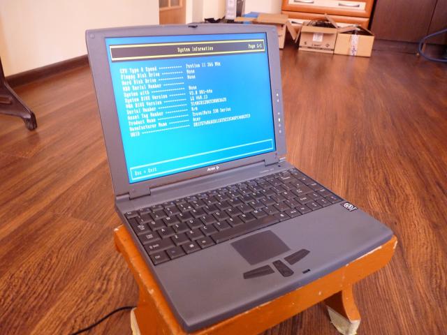 Model Acer TravelMate 332 T Processor Pentium-II Processor frequency 366 MHz Memory installed 256 Mb Hard Drive capacity 6,4 G Ports InfraRed, Serial, Parallel, RGB, PS/2, USB, Ext.Video Expansion Slots PC Card 1 x Type III slot or 2 x Type II slots Modem 56k, Integrated Isijungia, bet daugiau nieko nevyksta greičiausia neveikia hardas