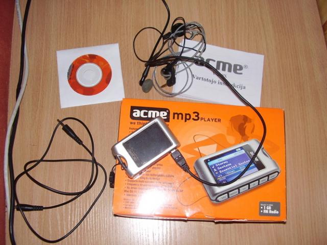 Acme mp3 grotuvas beveik nenaudotas, yra ausines, pakrovejas, dezute, vartotojo instrukcijos, CD diskas, usb laidas perkelimui. Vidine atmintis 1GB, dedasi kortele dar atminties. Yra radijas, groja ir video klipus, rodo vaizda per ekraneli.