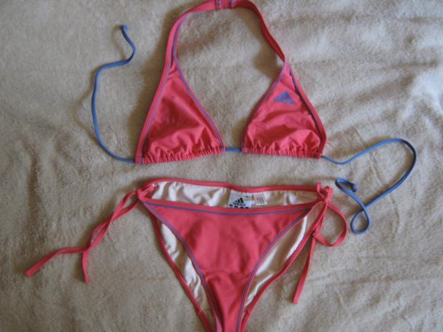 Puikios buklės ir kokybės atskiras Adidas moteriškas maudymosi kostiumėlis. fotografija daryta ant modelio nešiojančio 80 B dydi. Triusykėlių dydis M.