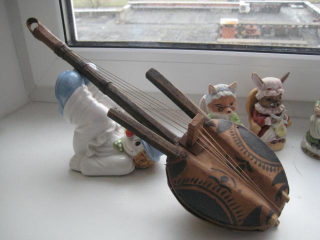 FOLK LUTE String instrument. Built in Africa, 1990's. This is a small, traditional African folk lute. Recently built, (appears to be built more for decoration than production of music). Nicely designed and detailed, with decorative markings, wood, leather and other natural materials.