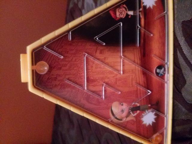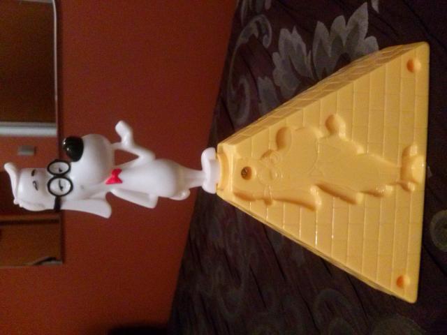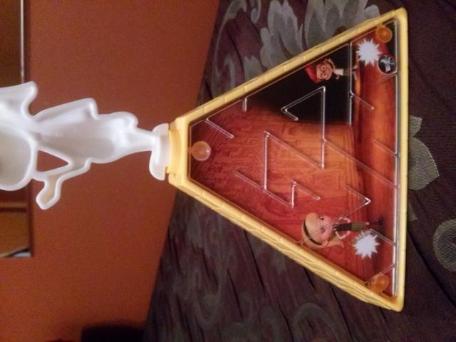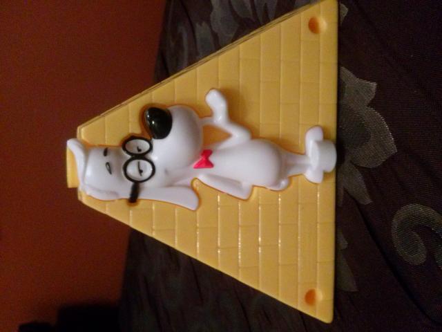 Žaidimas iš macdonaldo. Vienoje pusėje šuniuko statulėlė, išsiima ir pasistato ant piramidės. kitoje pusėje - žaidimas labirintas.