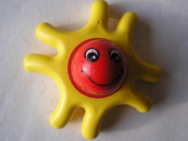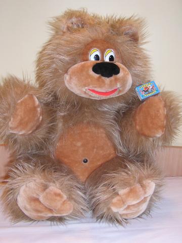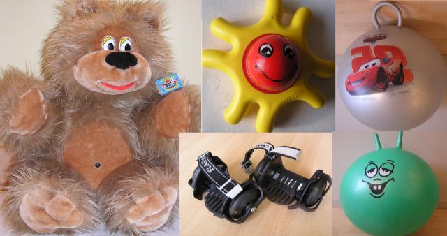1) Didelis pliušinis meškinas, 50 cm, 2) Lego kramtukas - aštuonkojis, skirtas kūdikiams, kojytės iš kietos gumos, galva plastmasinė, nežymiai aptrintas, 3) Flashing rollers, dedami ant batų kulnų, reguliuojamo pločio, 4) baltas šokinėjimo kamuolys su žiedu ir Žaibu Makkvynu mažesniam vaikui (45 cm), 5) žalias šokinėjimo kamuolys su ragais ir besišypsančiu veidu didesniam (60 cm).