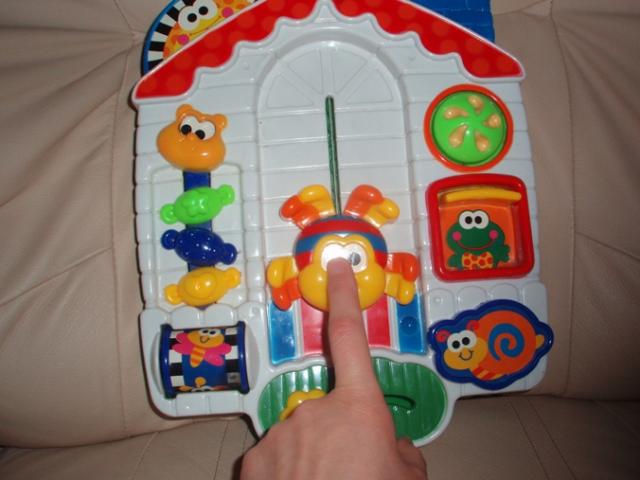 Yra brokas.Žaislo nugarinėj daly nulaužtas vienas burbuliukas, už kurio užsikabina dirželis.Todėl dabar žaislą galima pritvirtint tik vienu dirželiu. Gal kas mokėsit susiremontuot? Žaislas su geltonais dirželiais tvirtinamas prie lovytės šono. Skirtas jau sėdinčiam kūdikiui, kad galėtų su rankytėm tą žaislą pasiekt. Visi tie meškučiai ir burbuliukai juda.