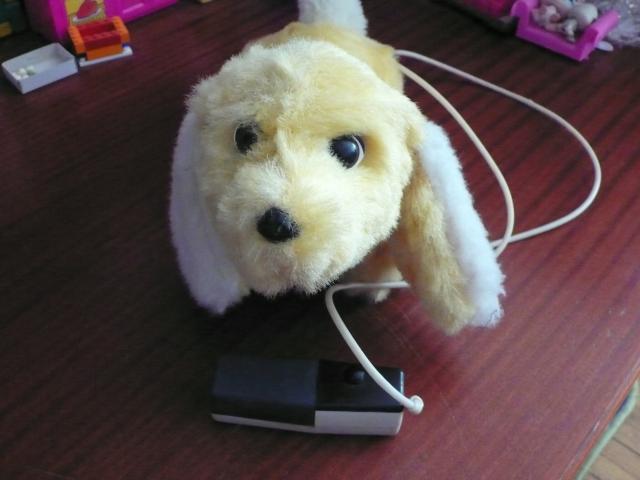 Tarybinis žaislas, veikia nuo baterijų, paspaudus valdymo mygtuką vaikšto ir linkčioja galva (turbūt ir loja - nepamenu).