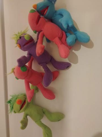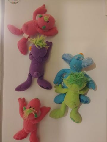 Penki žaisliukai. Keturių priekinėse letenytėse pritvirtinti magnetukai, mėlynas be magnetukų, jį prilaiko draugai :) Du rausvi vienodi. Nenauji.