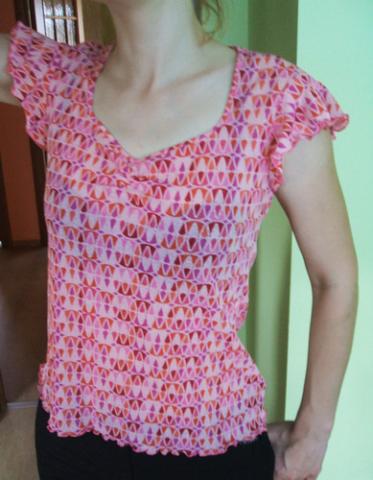 Malonių spalvų, parauktomis rankovėmis ir palaidinės gale bei šiek kiek iškirptės srityje:) Lengva, kiek persišviečianti, žodžiu, vasariška palaidinė. Tiktų S/M ideliai, bet ir laisvesniam S'ui.
