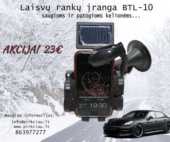 Akcija! BTL-10 laisvųjų rankų įranga vos už 23€ Daugiau informacijos: www.pirkciau.lt; info@pirkciau.lt PRISTATYMAS VISOJE LIETUVOJE! AKCIJA! Universalus telefono laikiklis su laisvųjų rankų įranga be BLUETOOTH už labai patrauklią kainą. Šio įrenginio nereikia sieti ar konfigūruoti su telefonu. Tinka įvairaus dydžio prietaisams. Laikiklis veikia be baterijų, pasikrauna vien saulės energija. Jame integruoti garsiakalbis ir mikrofonas patogesniam bendravimui. Įrenginys labai paprastai tvirtinamas prie tra