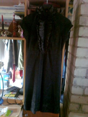 Juoda, seksuali, proginė suknelė. Dėvėta tik vieną kartą. Tinka tiek oficialiai progai, tiek šventiniam vakarui. Suknelė plonytė, su iškirpte, medžiagytė šiek tiek blizgi, nes turi neryškias blizgias gėlytes. Neilga, šiek tiek virš kelių. Tampri. Dydis - 42. Sudėtis: 100% poliesteris.