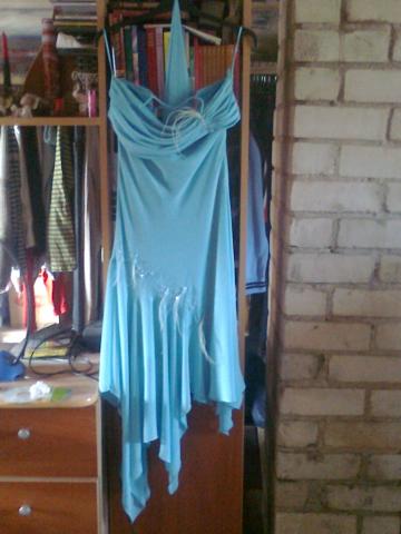 Žydros spalvos proginė suknelė. Dėvėta vieną kartą. Prie suknelės yra šalis. Dydis - 40. Sudėtis - 100% poliesteris. Siuvinėta karoliukais, bei plunksnelėm.