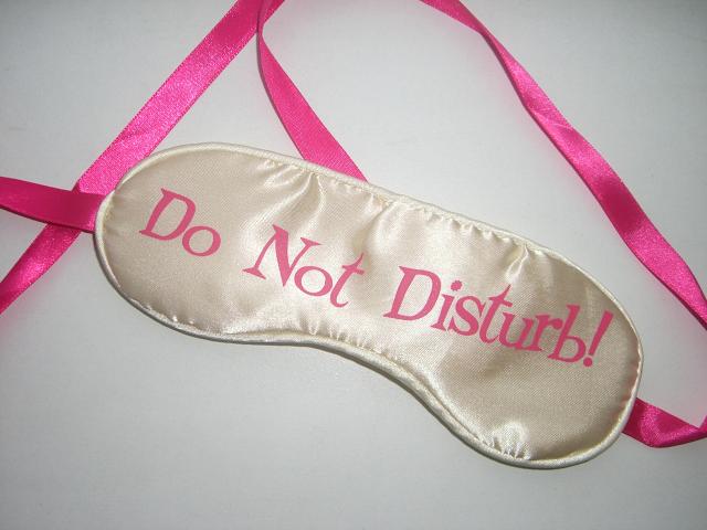 Akiu raistis nakciai su uzrasu ''Do Not Disturb!''. Is malonios liesti, svelnios medziagos. Susirisa roziniais raisteliais.