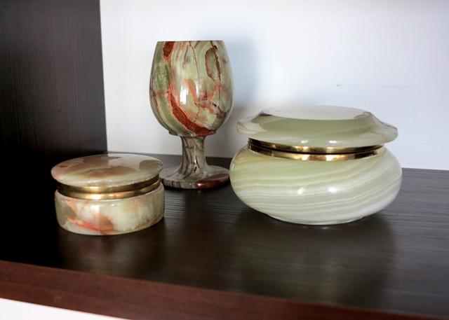 Tiesą pasakius neatsimenu koks čia akmuo, bet pasakojo - kad "šustras". Šis akmuo gydo, suteikia jėgų .. Akmeniniai indeliai (nežinau kaip kitaip pavadint) tinka papuošalams sudėti, arba šiaip kokioms brangesnėms smulkmenoms. Taurė - dėl grožio, arba gėrimams.. sako, jog vanduo geriamas iš šios taurės taip pat gydo.