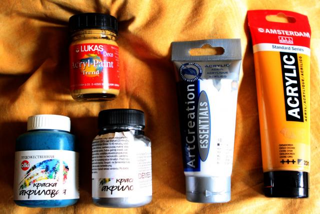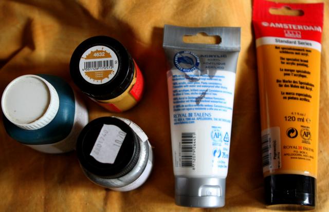 Akriliniai dažai, labai mažai naudoti. Sidabrinė visai nenaudota. Didelė ochros tūbelė - 3 eu, kitos - po 1,50 eu.