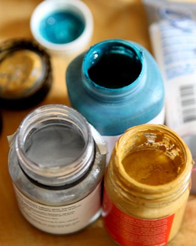 Akriliniai dažai tapybai - baltas, ochra, sidabras, mėlyna